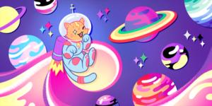 An orange tabby cat with yellow lightning markings in a blue spacesuit, wearing a jetpack, flying through pink and purple space. There are planets in the sky with colors representing a variety of pride flags.