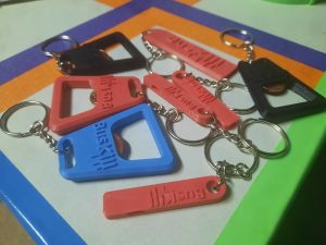 Image shows a collection of 3D-printed bottle openers and whistles that say "BusKill"